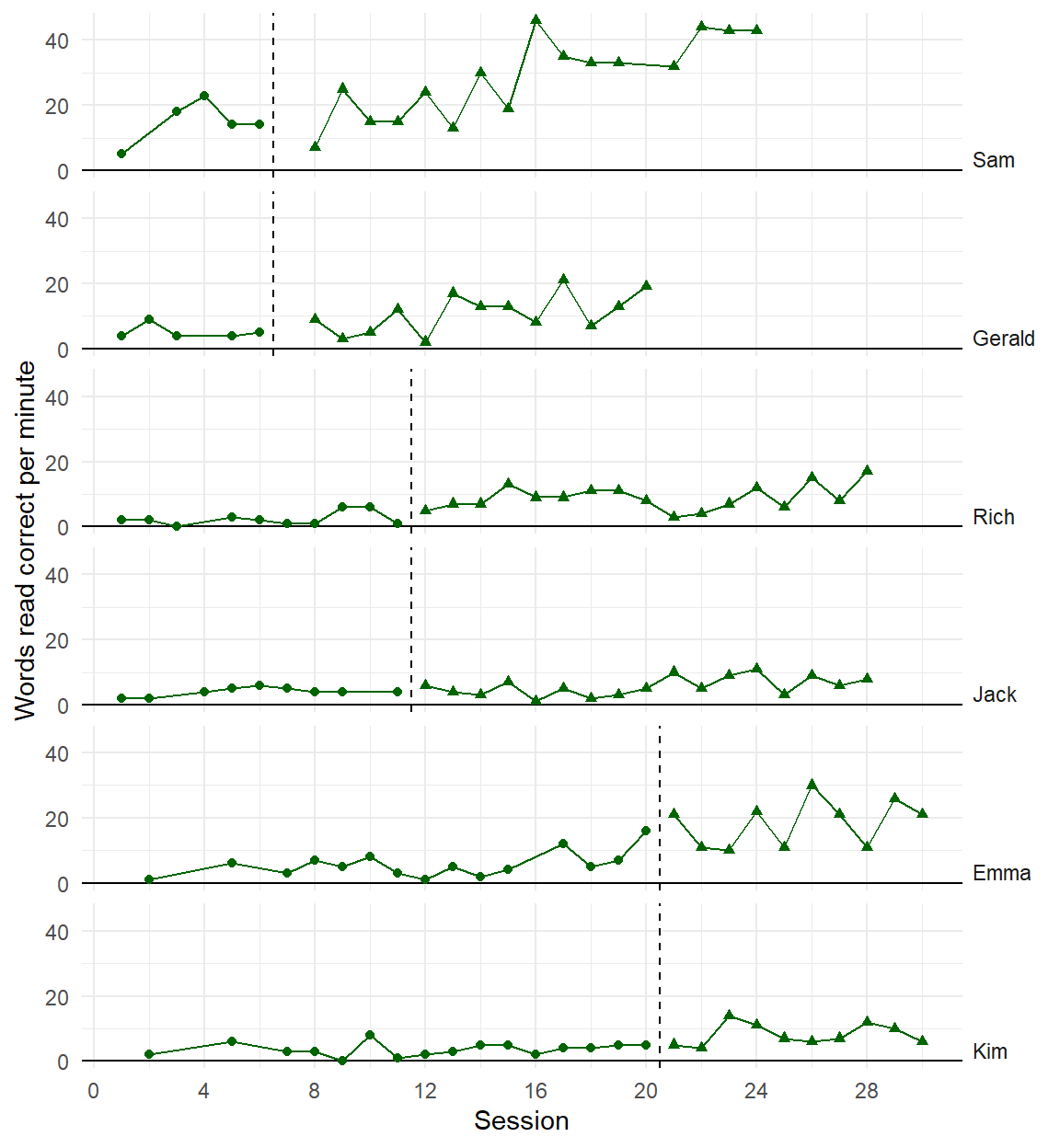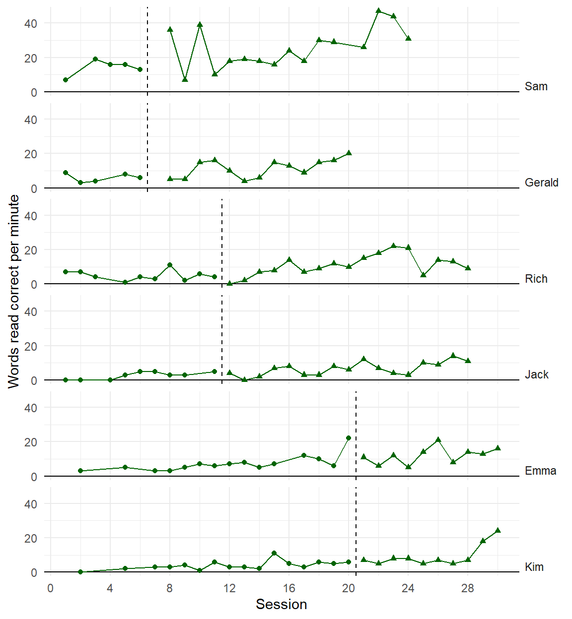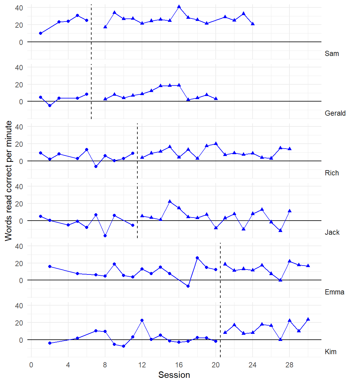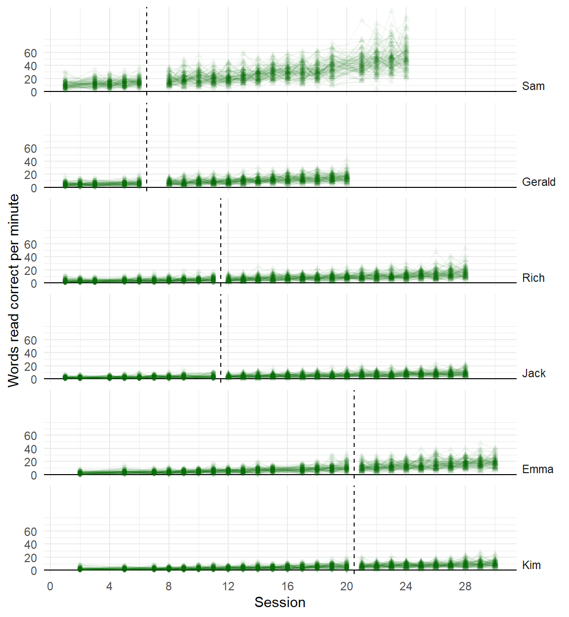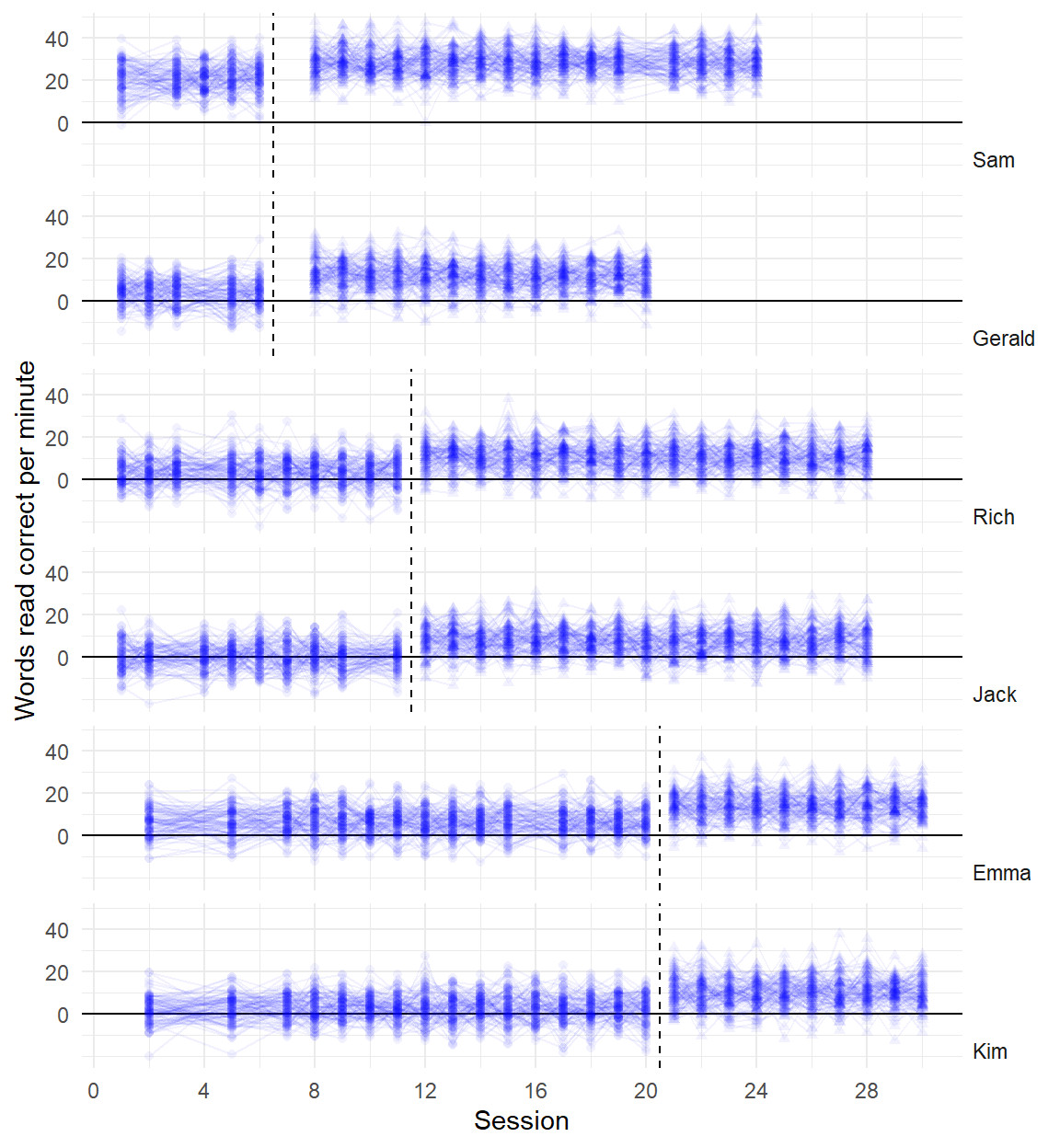 Grekov, Pustejovsky, and Klingbeil (2024) explore use predictive checks for meta-analytic models of oral reading fluency outcomes in SCDs.