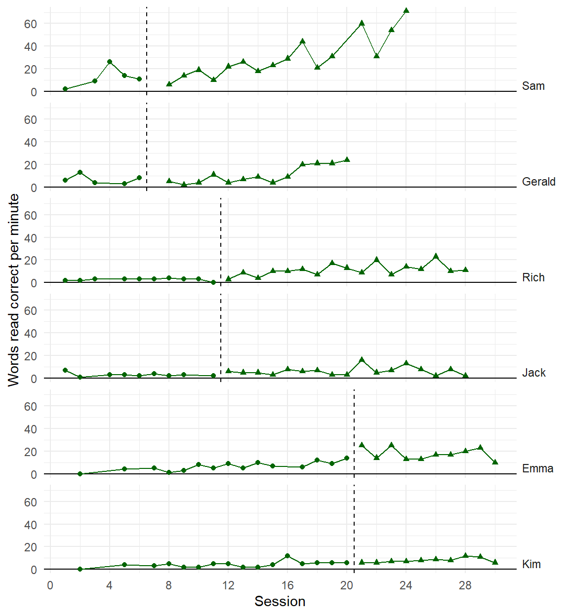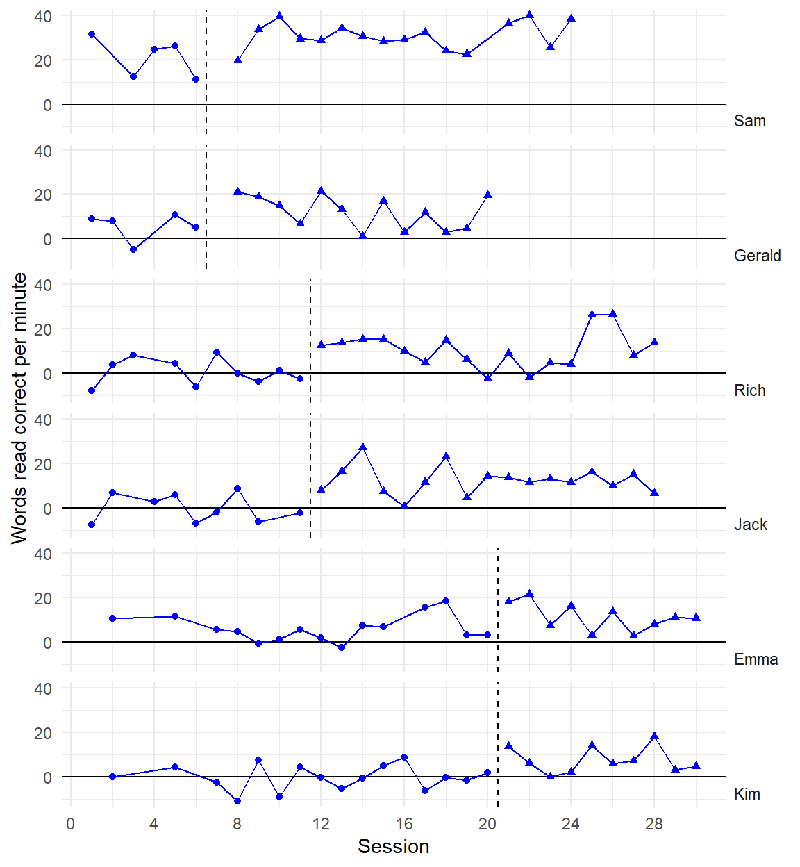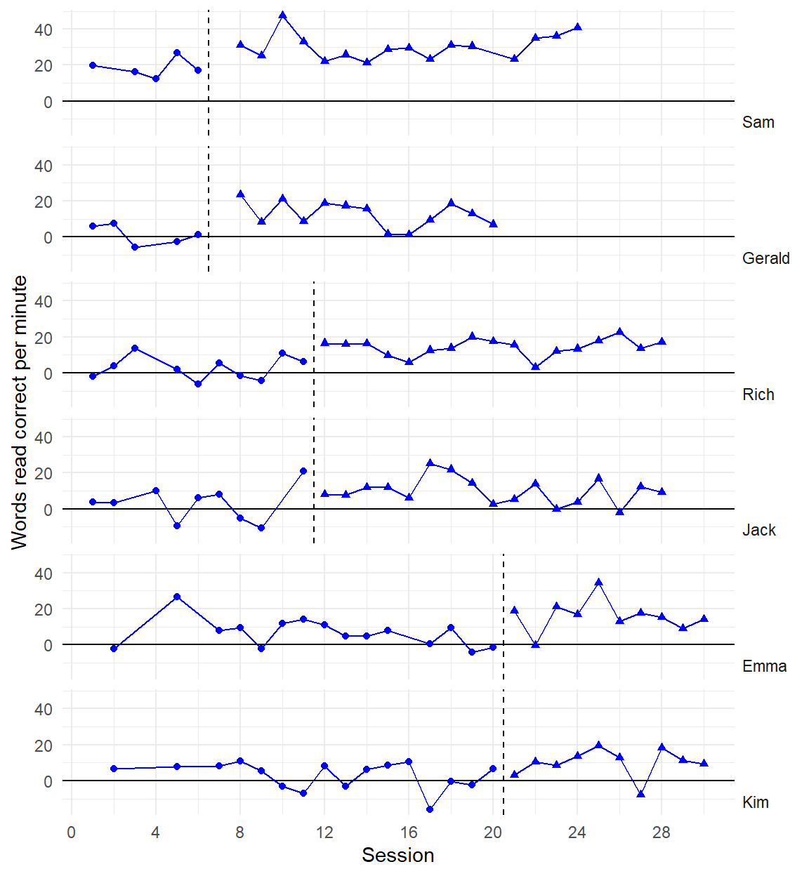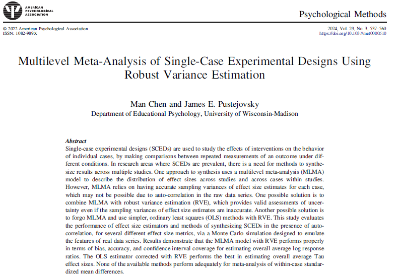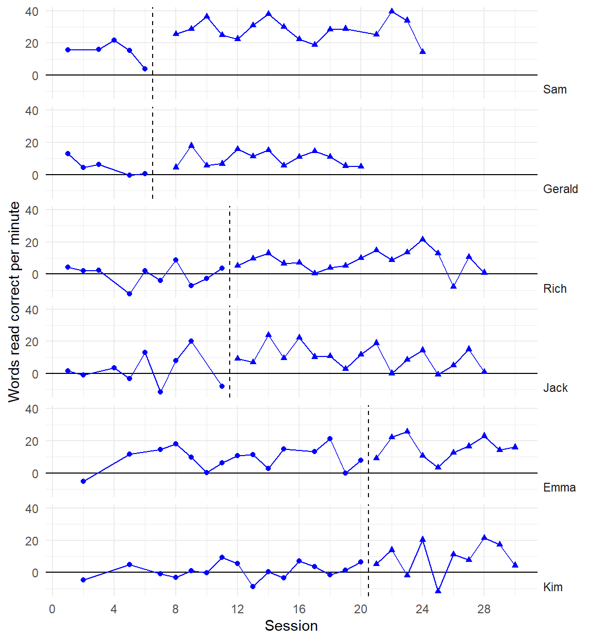 Grekov, Pustejovsky, and Klingbeil (2024) explore use predictive checks for meta-analytic models of oral reading fluency outcomes in SCDs.