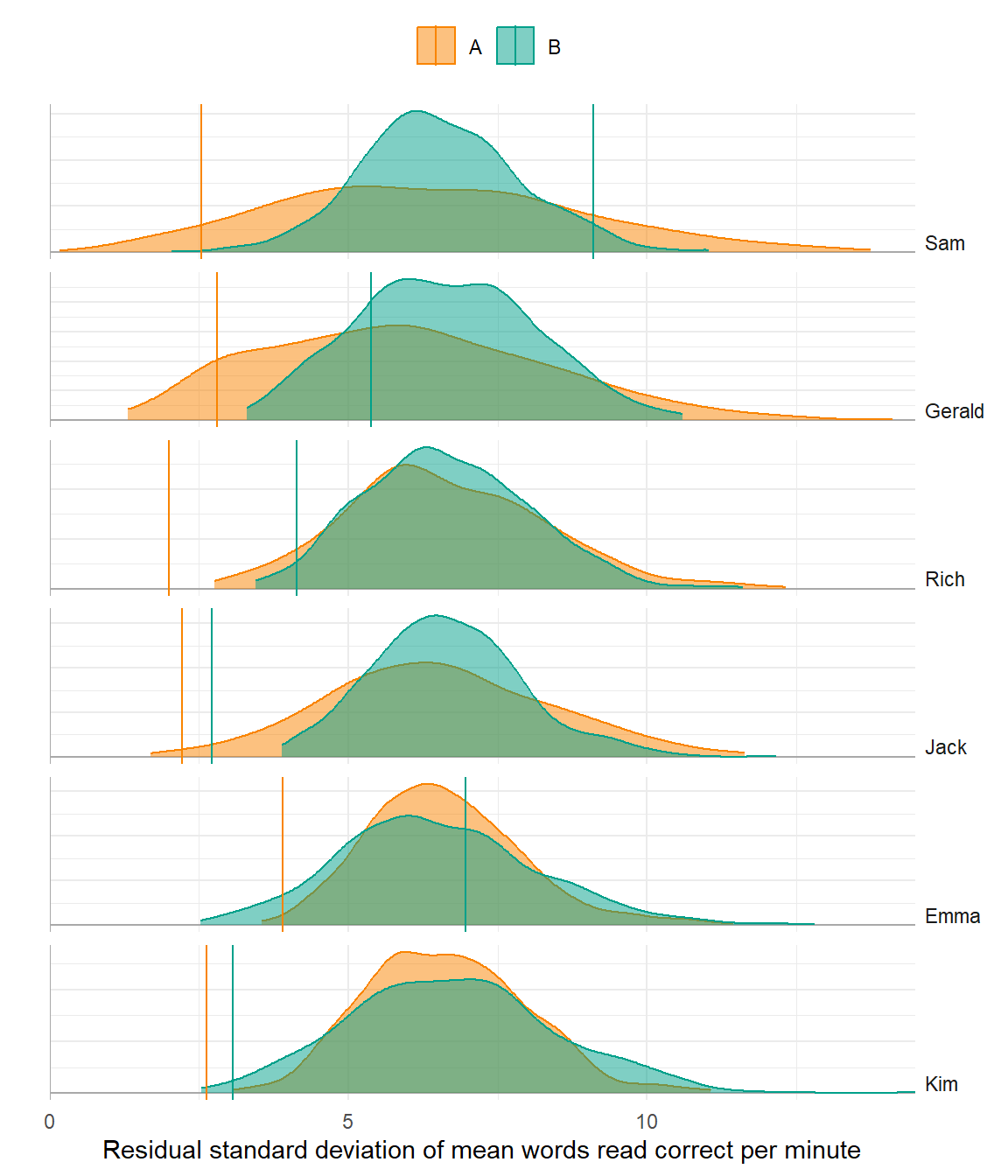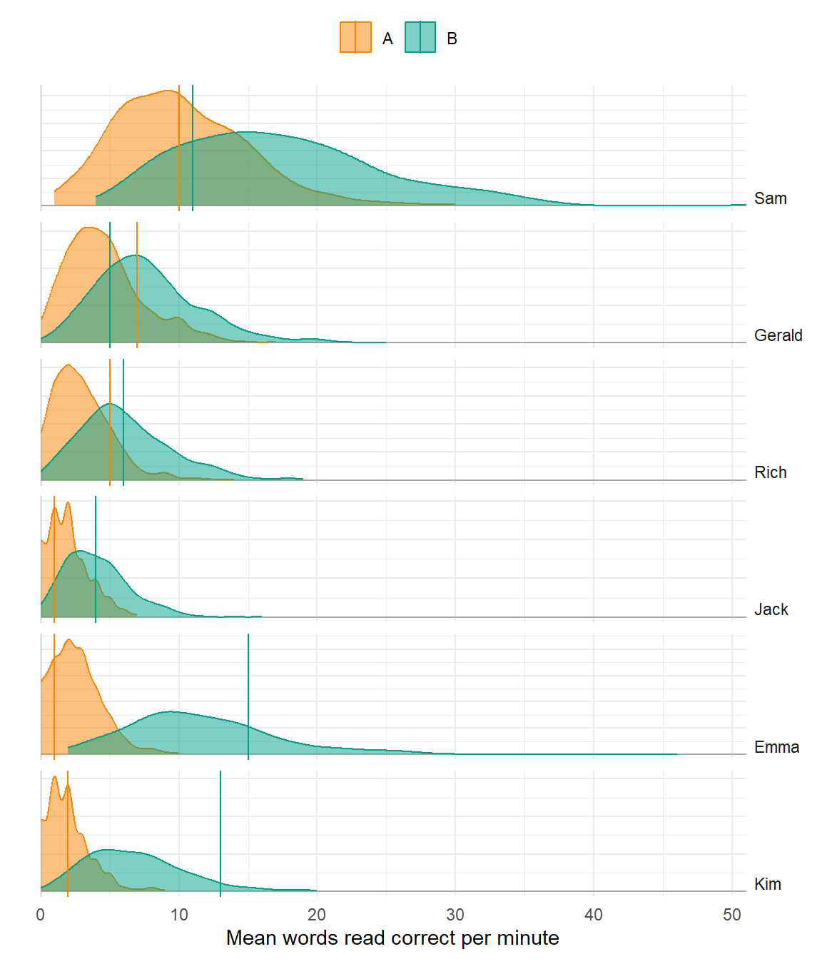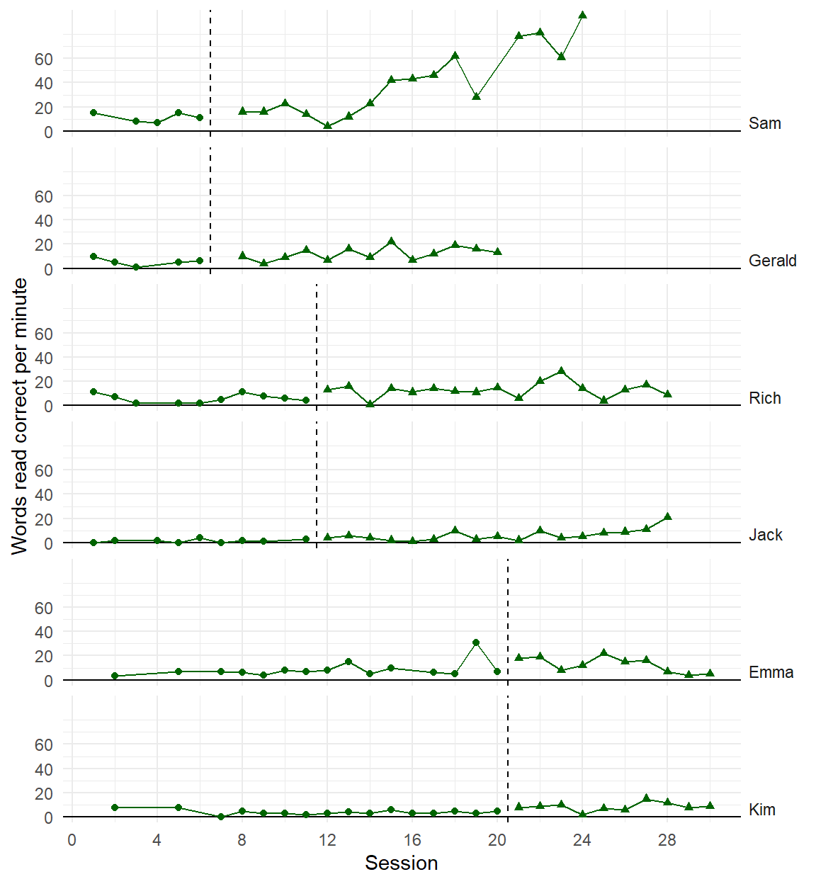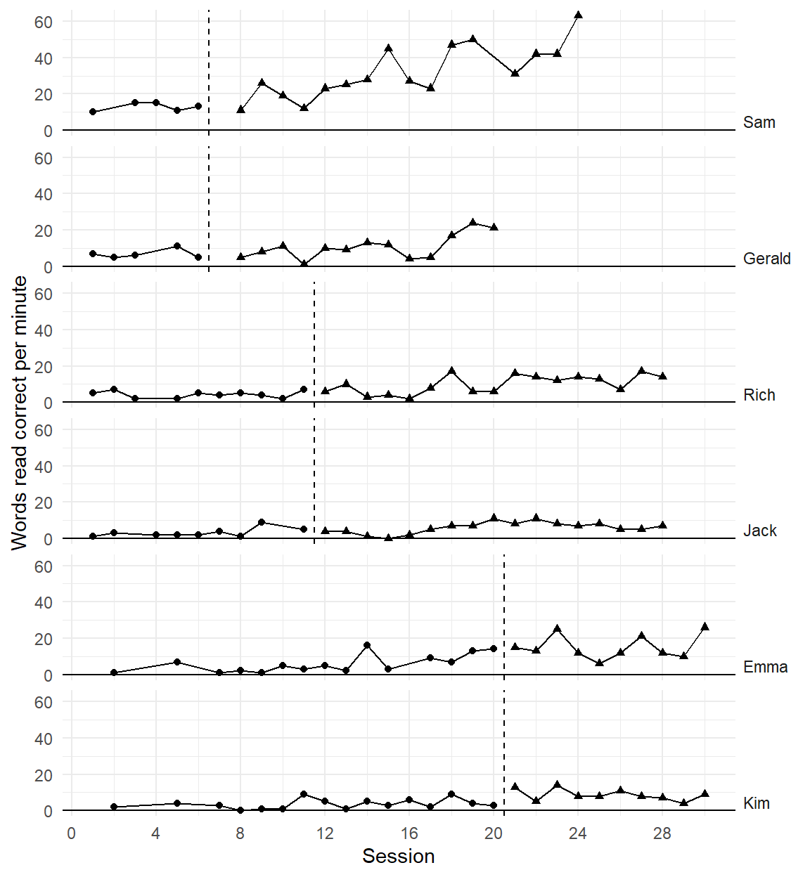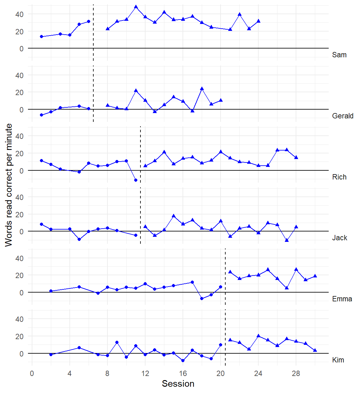 Grekov, Pustejovsky, and Klingbeil (2024) explore use predictive checks for meta-analytic models of oral reading fluency outcomes in SCDs.